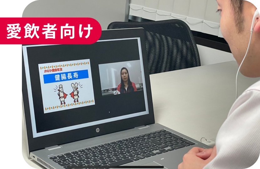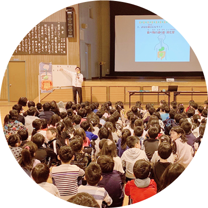当社では、学校・教育機関向けの「出前授業」、一般向けの「健康教室」で、腸と健康についての講義を行っています。うんちの状態から、食べ物の栄養を消化・吸収する腸の大切さ、腸にすみ着く乳酸菌のはたらきを解説し、いいうんちを出すための生活習慣について分かりやすくお伝えしています。健康のために、正しい食習慣・生活習慣を身につけてもらうことを目指しています。